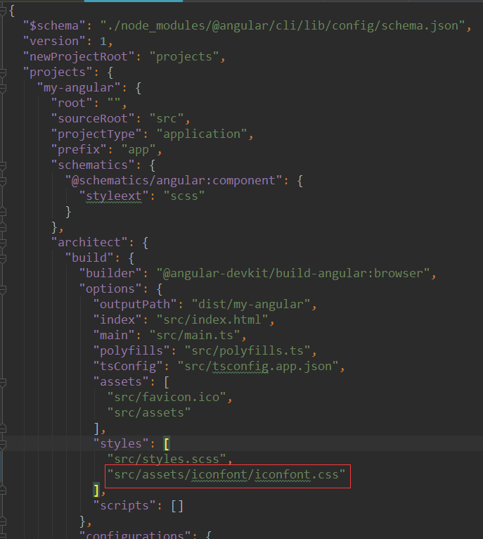 - 打开angular项目中的angular.json文件,在styles下加入"src/assets/iconfont/iconfont.css",注意用逗号与上一个css文件分隔开。
