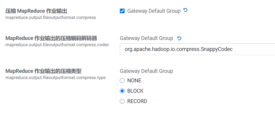 指定MapReduce作业输出的压缩方式,默认值RECORD,可配置值有:NONE、RECORD、BLOCK。推荐使用BLOCK,即针对一组记录进行批量压缩,压缩效率更高。