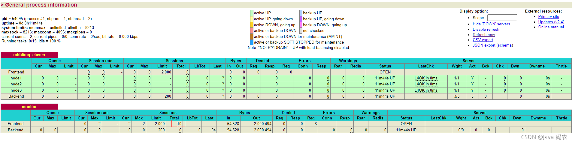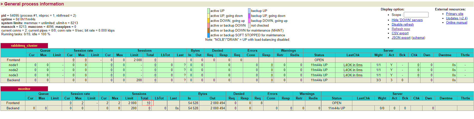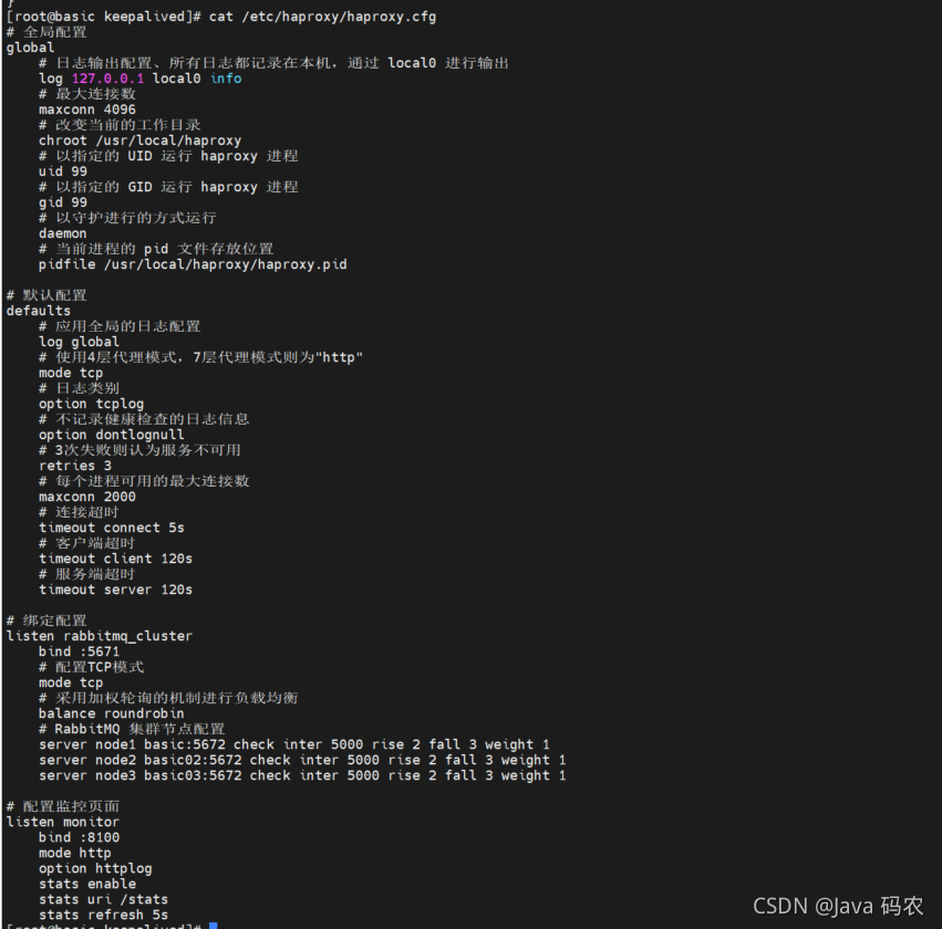 负载均衡的主要配置在 listen rabbitmq_cluster 下,这里指定负载均衡的方式为加权轮询,同时定义好健康检查机制: