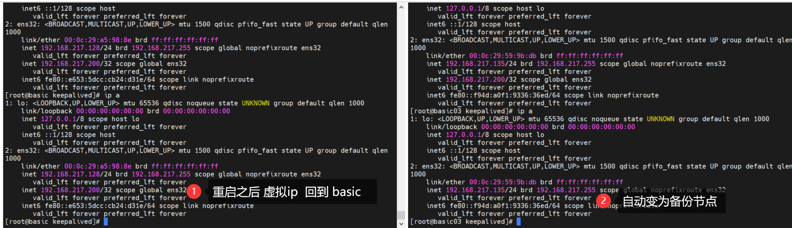 重启 basic 和观察状态 会自动将虚拟ip 切回 ,而basic03 将自动切换为备份节点状态