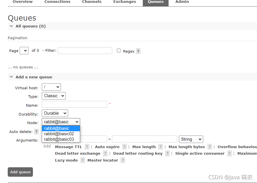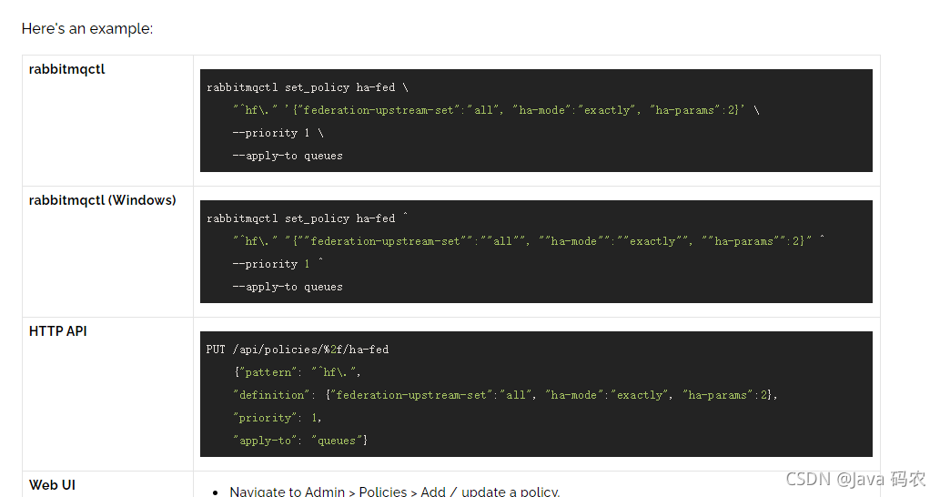 rabbitmqctl set_policy ha-all "^" '{"ha-mode":"all"}' 表示开启HA模式 适用于所有的队列