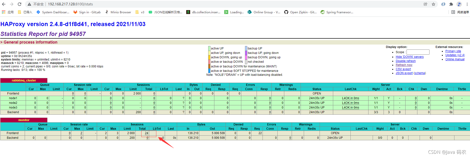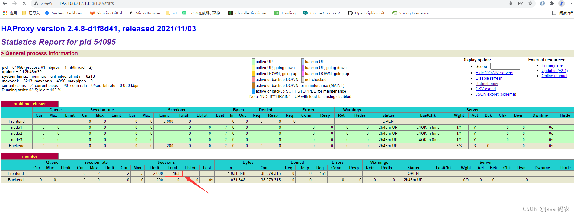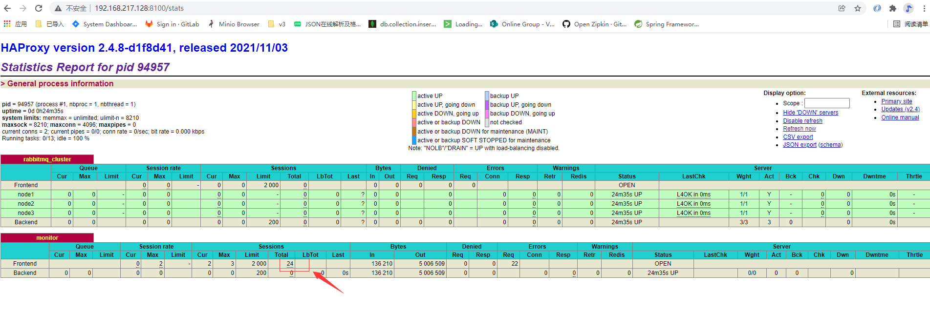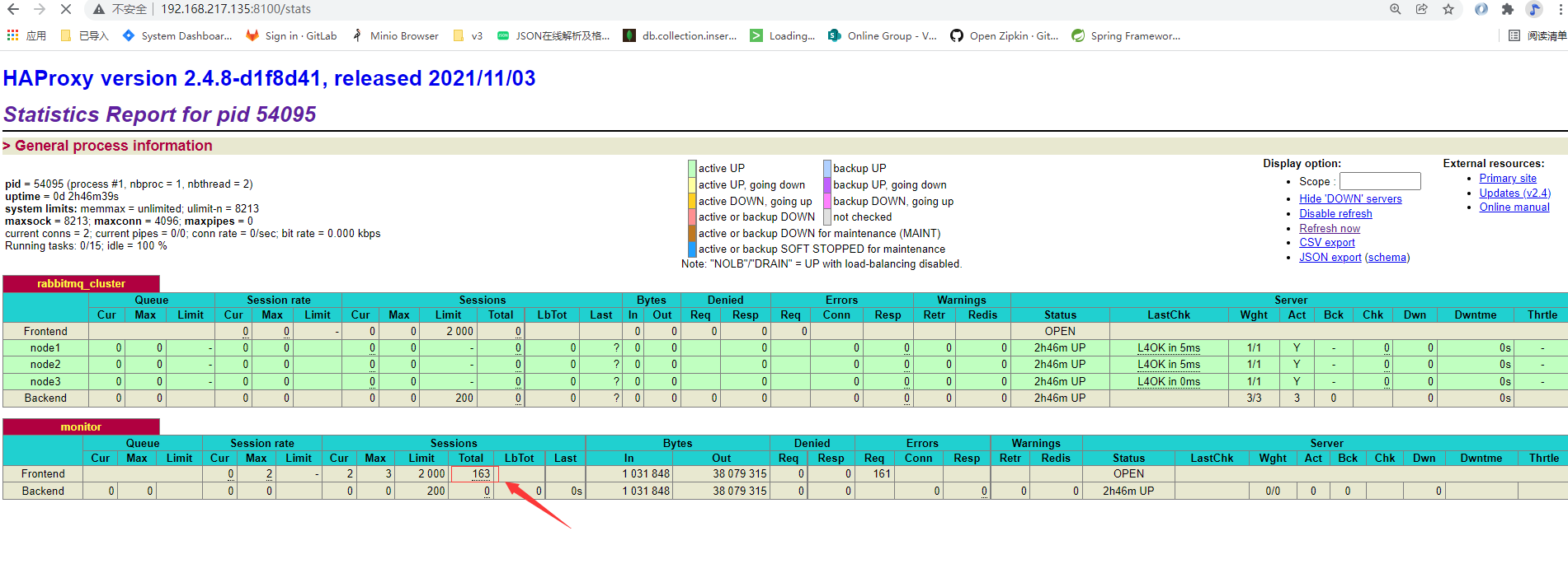 再查看 Haproxy 发现两个 haproxy 的节点上 收到了 不同的请求次数,说明负载均衡已经生效