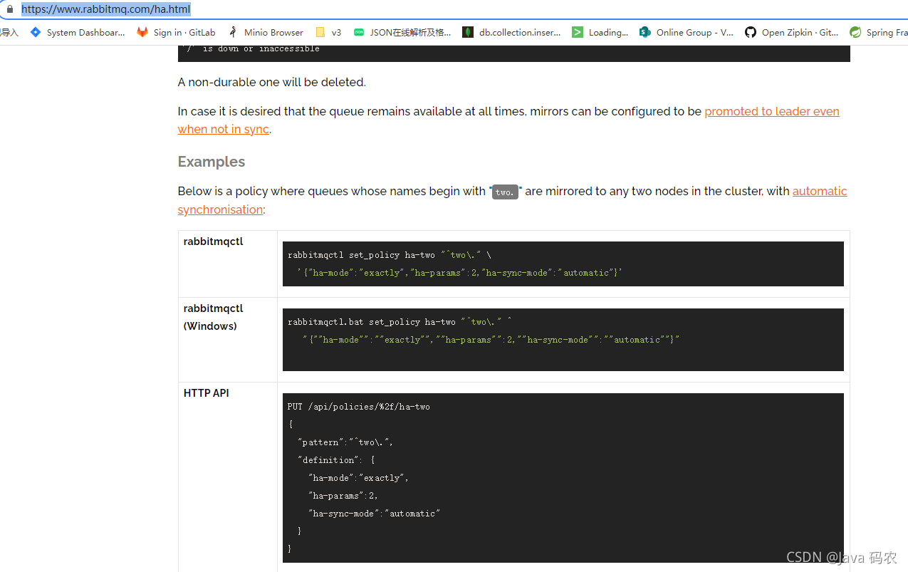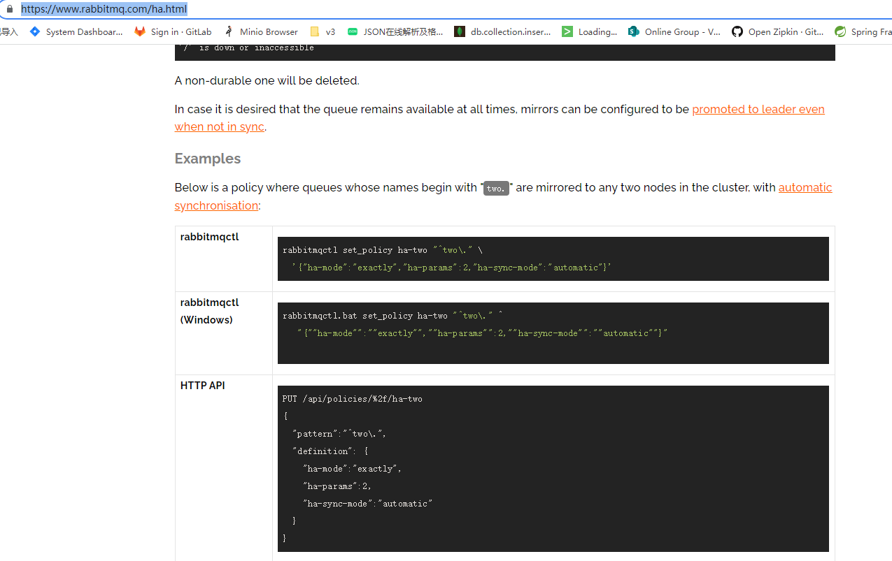 在上面我们指定了 ha-mode 的值为 all ,代表消息会被同步到所有节点的相同队列中。这里我们之所以这样配置,因为我们本身只有三个节点,因此复制操作的性能开销比较小。如果你的集群有很多节点,那么此时复制的性能开销就比较大,此时需要选择合适的复制系数。通常可以遵循过半写原则,即对于一个节点数为 n 的集群,只需要同步到 n/2+1 个节点上即可。此时需要同时修改镜像策略为 exactly,并指定复制系数 ha-params,示例命令如下:
