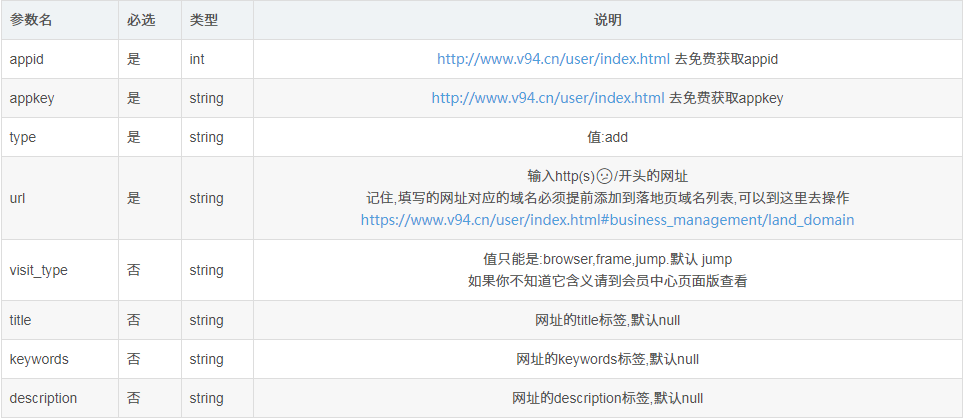 https://v94.cn/api/DomainShortUrl.json?appid=37****15&appkey=a50d38748960******80ae1a725b7c95&type=add&visit_type=jump&title=title1&keywords=keywords1&description=description1&url=http://www.cnblogs.com/shanyou/p/11219156.html