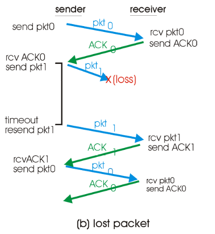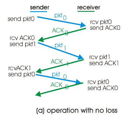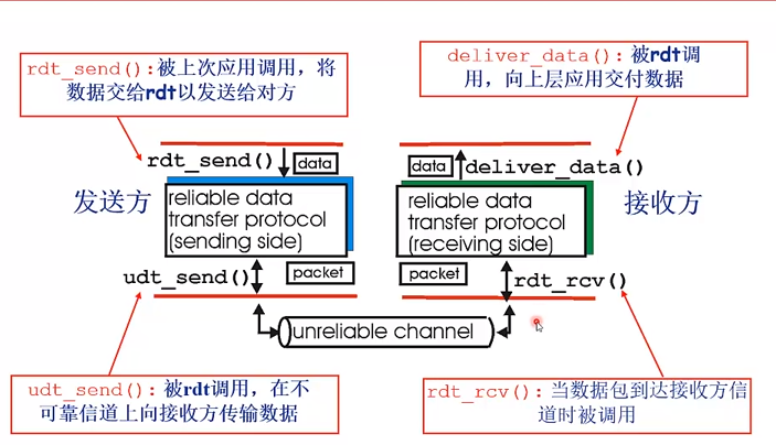 - 可靠数据传输rdt原理: 现实中很多信道是不可靠的,很可能会发生丢包(由缓存溢出)等错误,所以我们需要使用技术手段来是传输变得可靠