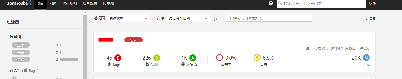 接下来sonarqube会开始分析代码,分析完成后,可在项目列表中找到对应的项目分析结果