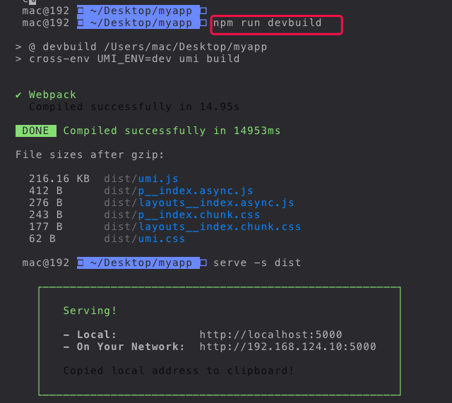 "scripts": { "start": "umi dev", "test": "umi test", "devbuild": "cross-env UMI_ENV=dev umi build", "build": "cross-env UMI_ENV=prod umi build", "lint": "eslint --ext .js src mock tests", "precommit": "lint-staged" },5. 测试,在 app.js 中 写入打印 process.env.apiUrl , 然后重启 开发 服务