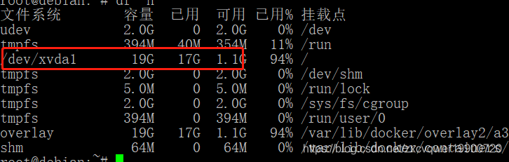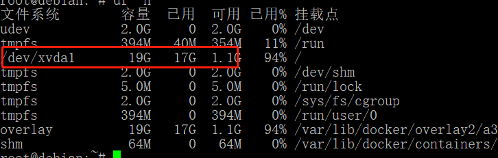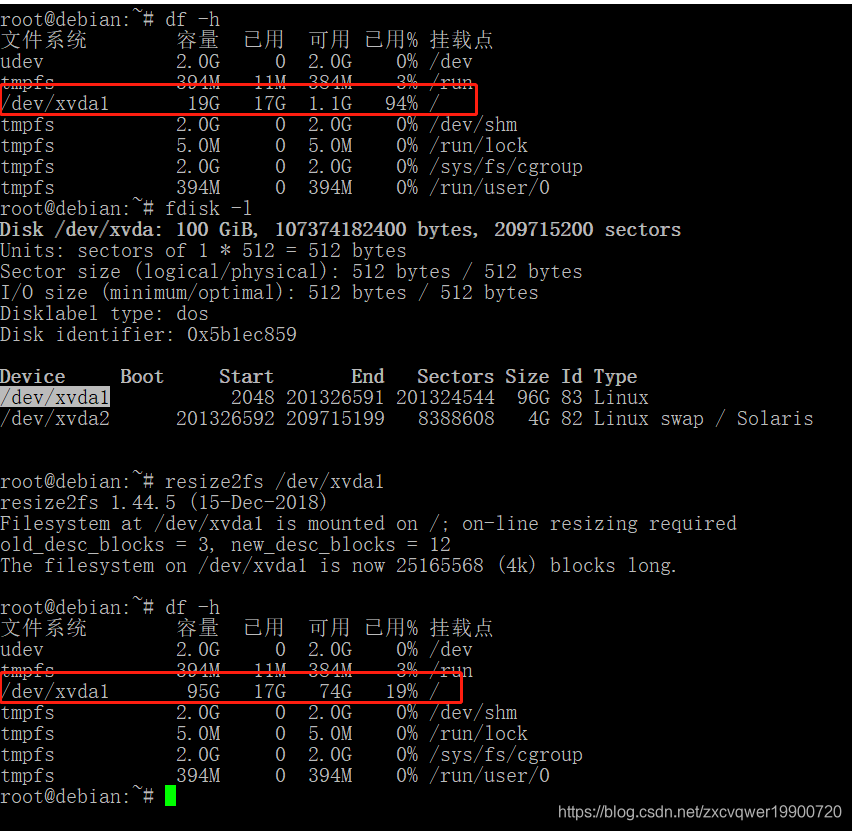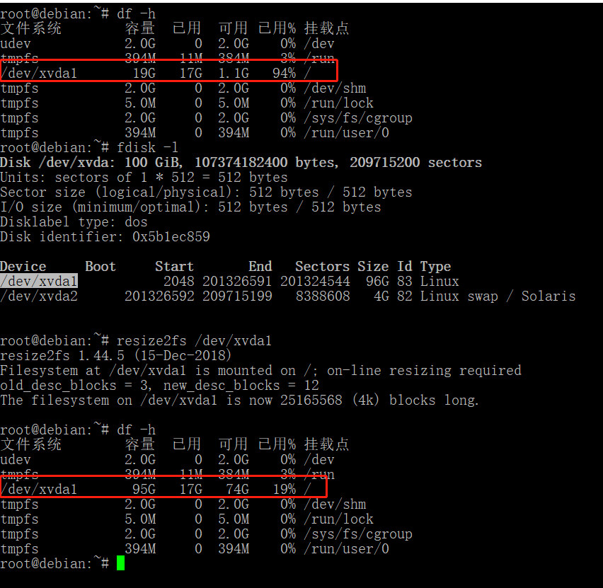 8. 重启,然后 df -h 查看到主盘并没有变大,因为文件系统还没扩充,使用指令 resize2fs /dev/xvda1 扩充即可