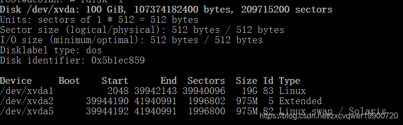 操作系统 debian10.9,原始磁盘大小20G,目标扩充到100G,安装系统的时候全部选择的默认选项,因此实际的操作系统还分出了一块 swap 分区。