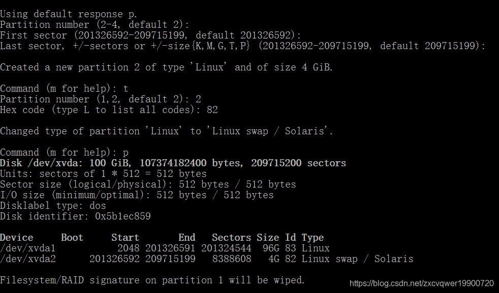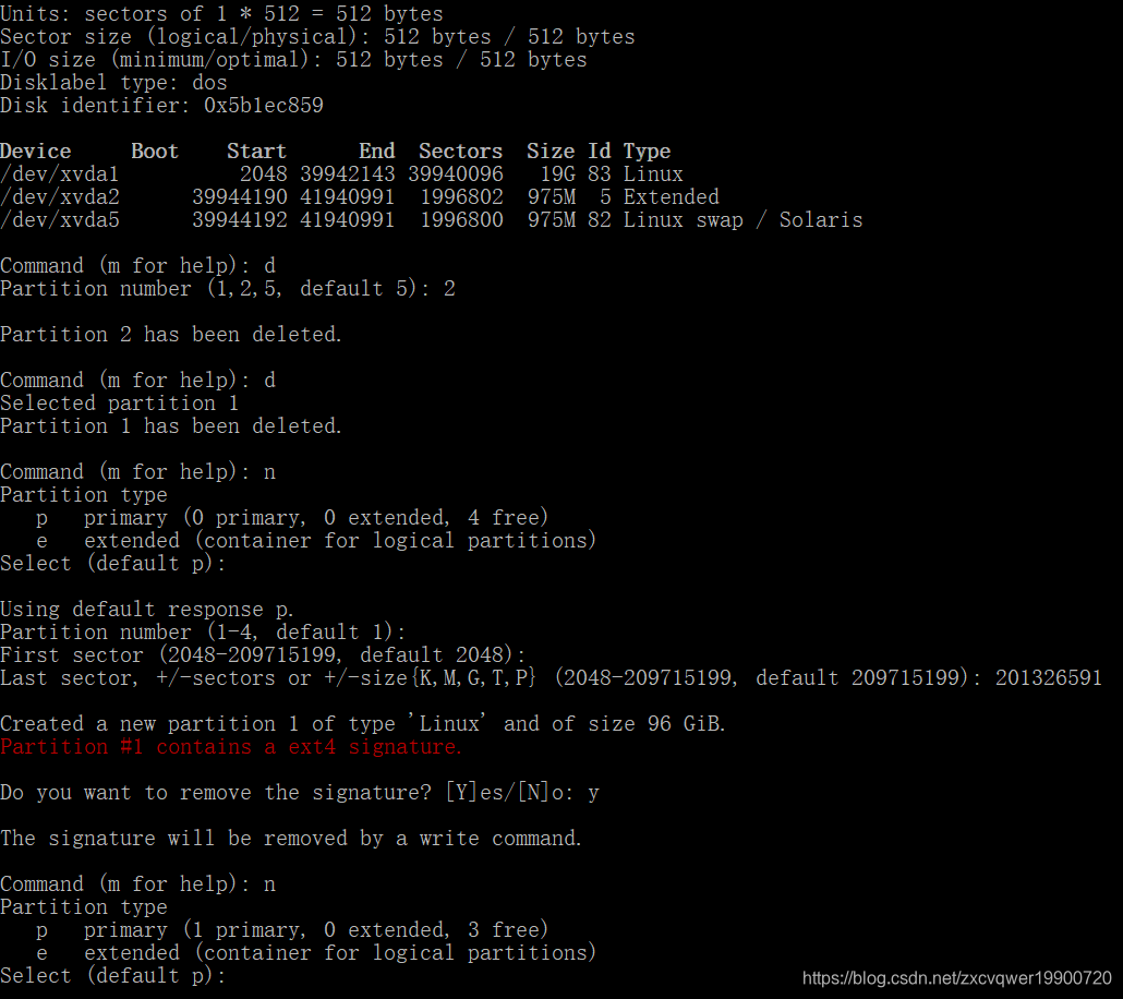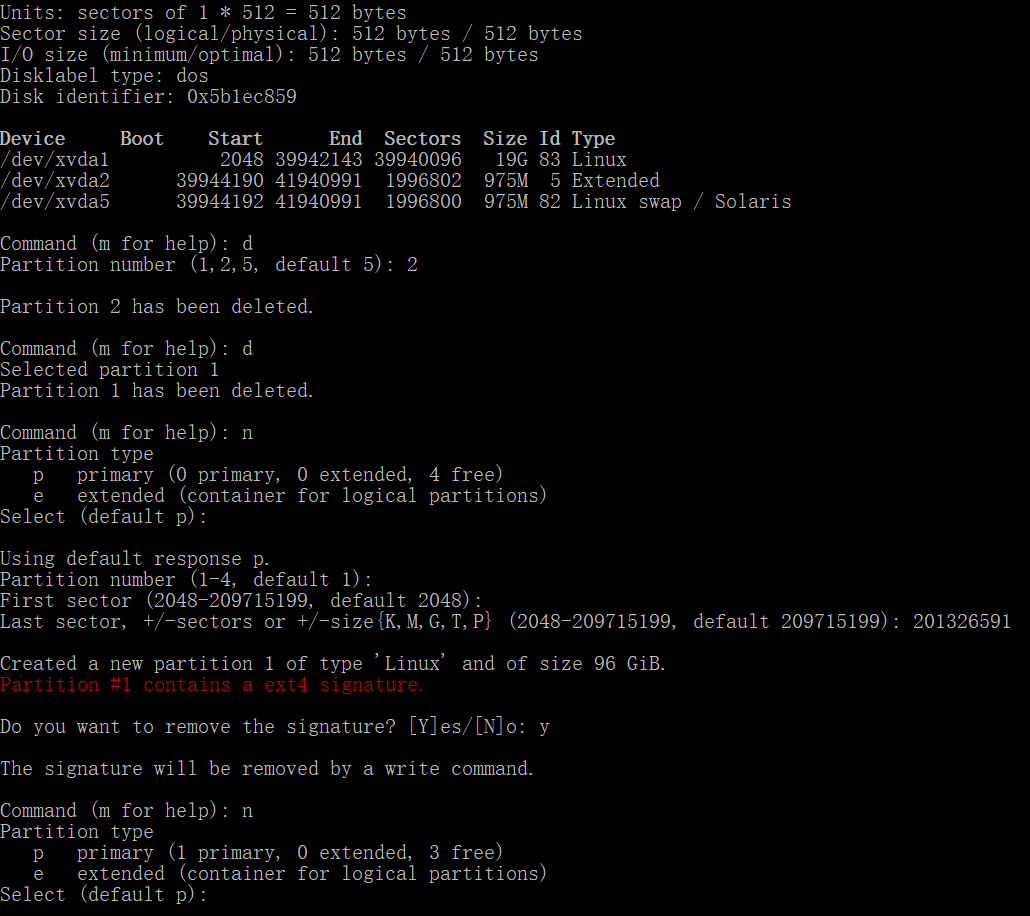 3. fdisk /dev/xvda 进入分区模式,【/dev/xvda】这个参数根据你实际的情况修改。