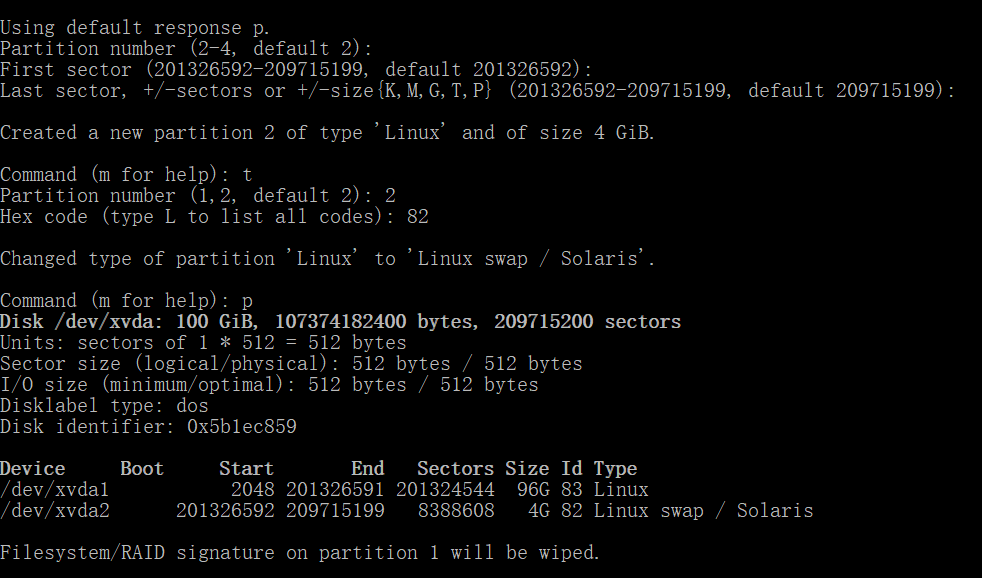 中间过程中,需要键入一次 a ,选择磁盘1,写入启动信息;需要键入一次 t,选择磁盘2,键入82 将其ID修改为 swap