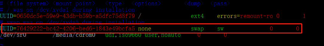 然后修改 /etc/fstab 文件,将里面已经存在的 swap 分区信息的 uuid 换成上面那条指令生成的即可。