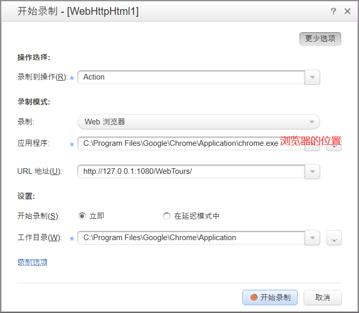 开始录制脚本:选择要将脚本录制在哪个地方;录制的方式(以浏览器为例),找到浏览器所在的位置,设置要录制的URL地址;