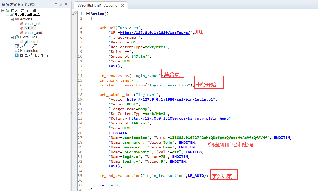 VuGen 中的脚本分为三部分:vuser_init、vuser_end 和Action。