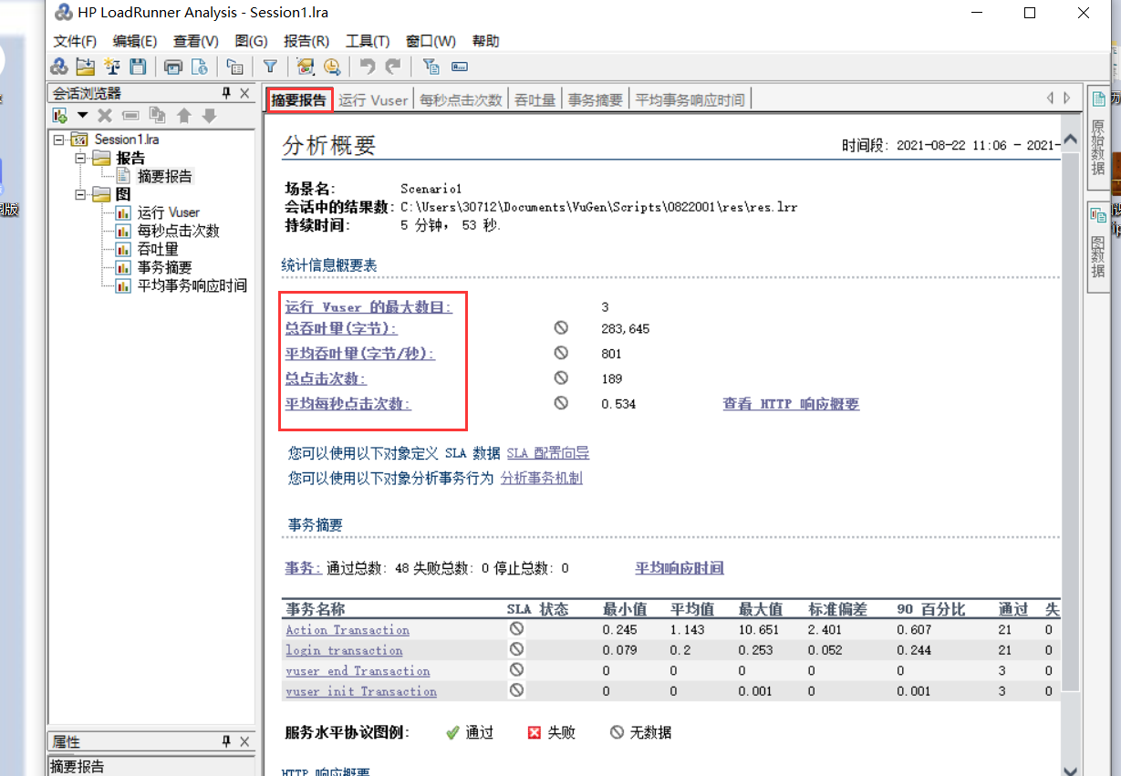 事务摘要图显示了整个测试期间的事务摘要,包括每一个事务的pass,fail等。 对事务进行综合分析是性能分析的第一步,通过分析测试时间内用户事务的成功与失败情况,可以直接判断出系统是否运行正常。