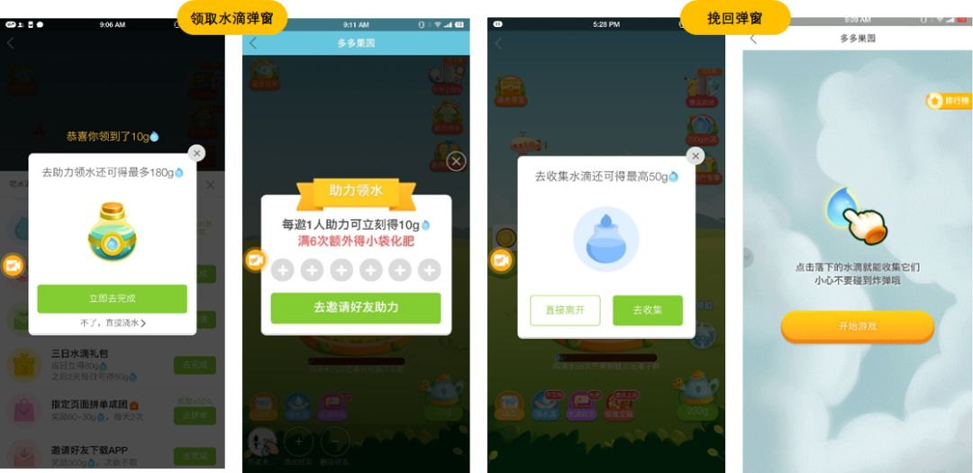 (如:“多多果园”的领取水滴弹窗,会引导用户去完成助力领水的任务——上图)