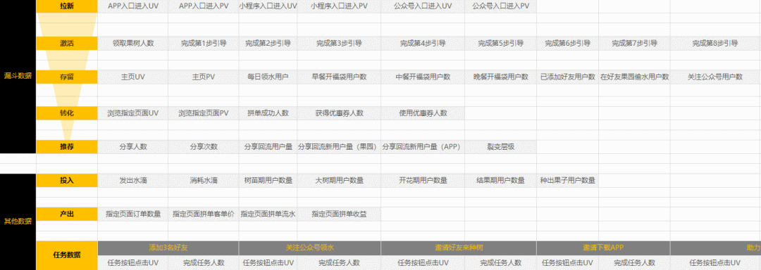 然后梳理产品中一些数值相关的数据需求(如:水滴,积分,红包……),用于结合相关数值的价值和路径的转化率计算ROI