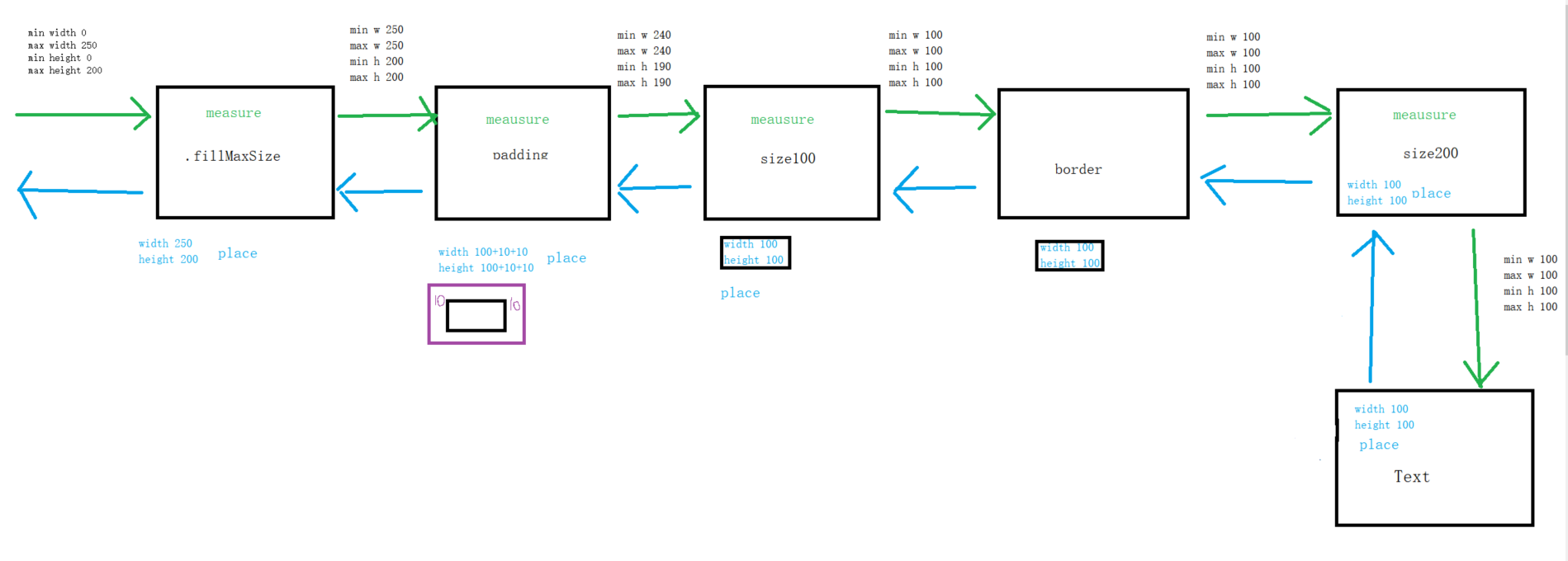 7: 最后,整个text收到100 x 100的信息,它就把自己size设为100 x 100,然后把size信息(蓝色部分)传上去