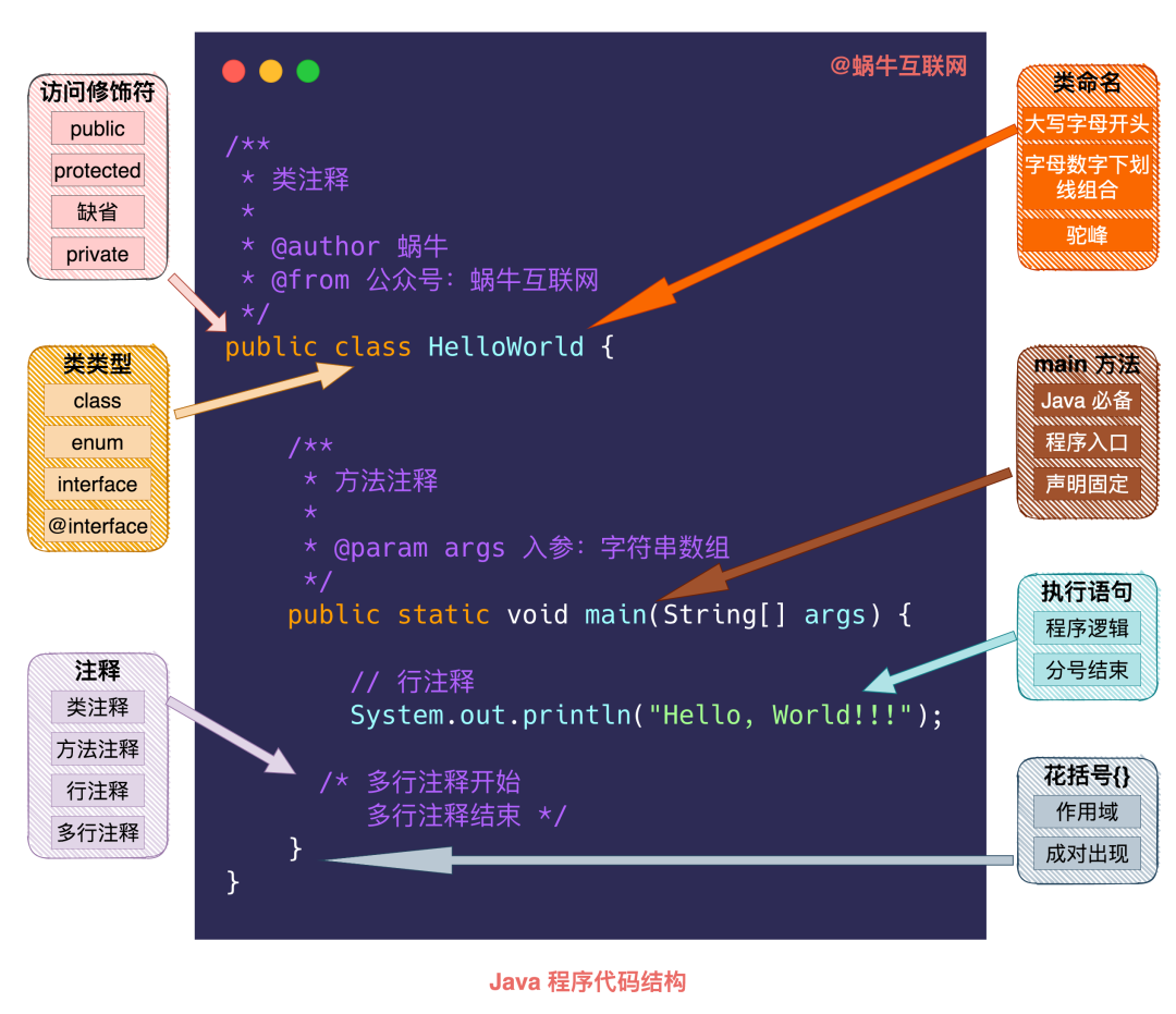 其实我们上篇提到的 HelloWorld 程序就是一个完整的 Java 程序,它由访问修饰符、类类型、类命名、main 方法、执行语句、花括号和注释这几个核心要素构成。