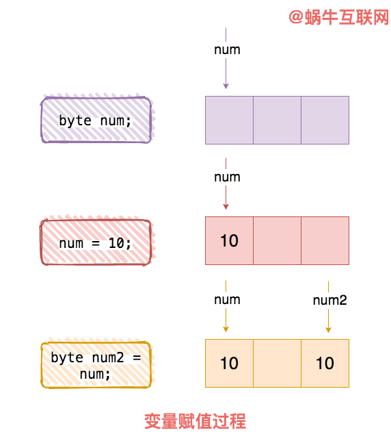 比如较小的整数可以用 byte num; 表示。变量也可以做赋值操作,比如 num = 10; 就把 10 这个整数赋值给了 num 这个变量。另外,变量也支持传递,比如 byte num2 = num; 就是把 num 的值传递给了 num2。