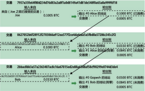 Alice用在Joe那里换的0.1BTC去Bob的店里买了一杯,咖啡的价格是0.015。Joe转给Alice的那笔交易在使用之前是被Alice的私钥(前面创建前面时生成的,跟自己的地址对应)锁定的,必须使用Alice的密钥签名后才能使用,Alice使用自己的密钥解锁了该笔交易将比特币支付给Bob,同时锁定对他的那笔输出,需要Bob的密钥才能解锁使用。通常输入会大于输出,那是因为每笔交易包含了一笔交易费(输入-输出)。交易费是为了鼓励矿工将交易进行打包,矿工会将这个交易费作为自己酬劳一起写入区块。同时输出里也可能包含一笔输出的到自己的比特币,这样是为了找零,因为输入值不一定能刚好等于本次消费的数额。