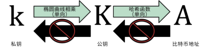 在创建钱包时,用户有一个对应钱包地址的私钥,有了这个私钥可以通过椭圆曲线函数计算出对应公钥,公钥是公开给其他用户的,比特币地址则是公钥通过哈希函数计算出的结果,这两个计算都不具备可逆性。它们三者的关系如上图所示。