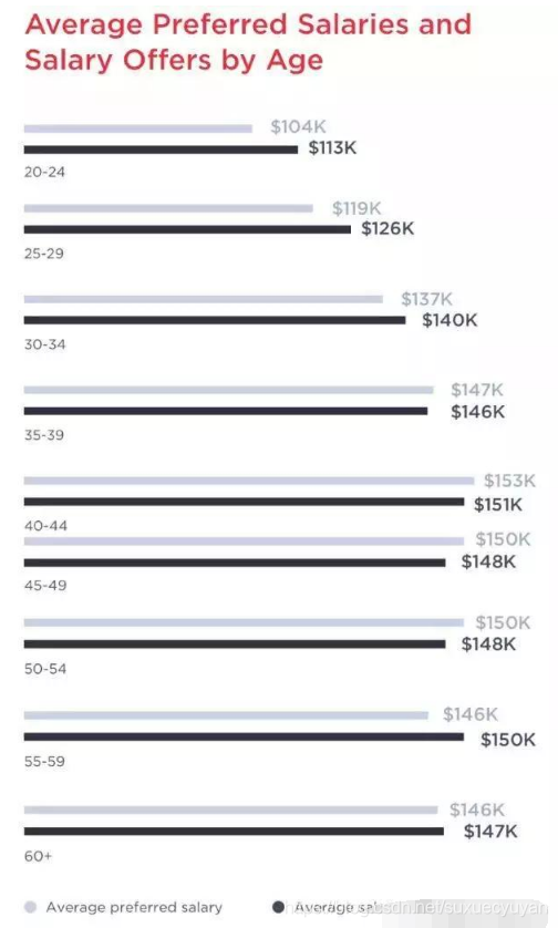由上表可见,外国科技工作者的薪水在40岁中期达到高峰15.1万美元,随后稍有下降,并会一直在15万美元左右徘徊,直到退休。