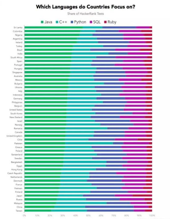 总的来说,全世界的程序员选用Java的比例都要高于其它语言(只有极少数的例外:如马来西亚和巴基斯坦的程序员更喜欢C++,台湾的程序员更喜欢Python)。斯里兰卡的程序员是选Java比例最高的,为HackerRan贡献了相当多程序员的印度则排名第八。