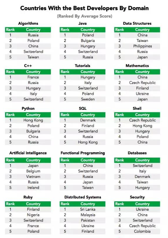 各国程序员在哪些特定领域表现最好呢?请看下图: