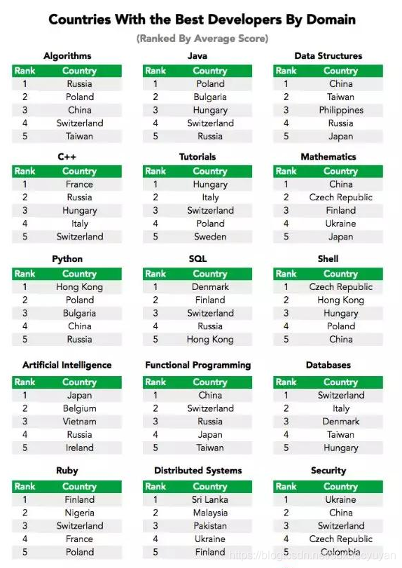 美国程序员社区HackerRank曾经做过一个调查:哪个国家拥有最好的开发者,结果让人大跌眼镜。该调查为每个领域制定了打分标准,使用z评分模型,得出了以下的结果: