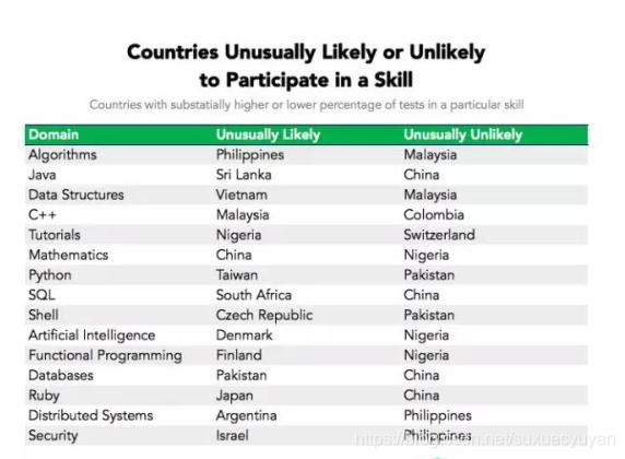 如上表所示,中国程序员在数学竞赛中的参与度远远高于预期平均水平。捷克人shell编程第一,很擅长这项。其他国家的选择偏好和擅长领域好像并没有必然联系。