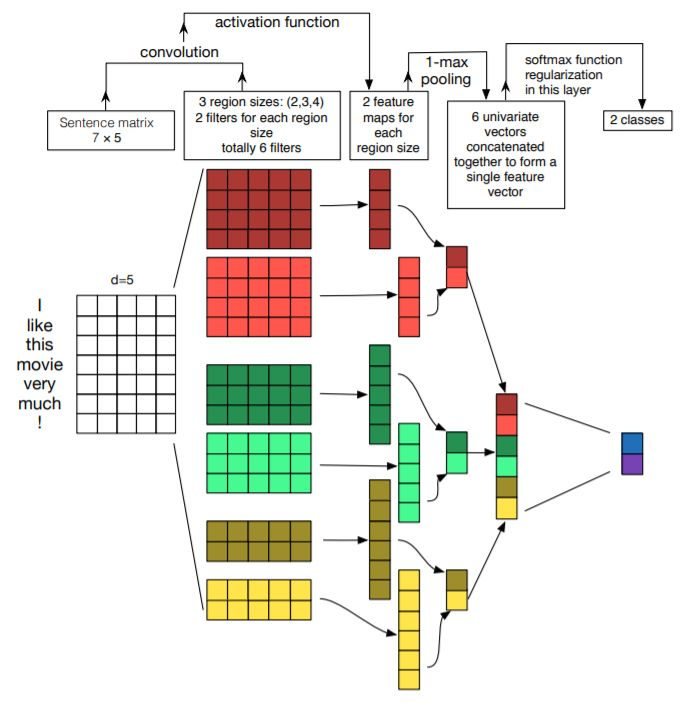 下面我以一张经典的图来简单介绍了以下TextCNN模型。在2014年提出,Yoon Kim使用了卷积 + 最大池化这两个在图像领域非常成功的好基友组合。我们先看一下他的结构。如下图所示,示意图中第一层输入为7*5的词向量矩阵,其中词向量维度为5,句子长度为7,然后第二层使用了3组宽度分别为2、3、4的卷积核,图中每种宽度的卷积核使用了两个。其中每个卷积核在整个句子长度上滑动,得到n个激活值,图中卷积核滑动的过程中没有使用padding,因此宽度为4的卷积核在长度为7的句子上滑动得到4个特征值。然后出场的就是卷积的好基友全局池化了,每一个卷积核输出的特征值列向量通过在整个句子长度上取最大值得到了6个特征值组成的feature map来供后级分类器作为分类的依据。