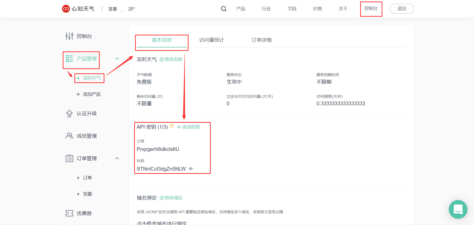 具体步骤:进入控制台--->产品管理--->添加产品(天气数据API)--->申请免费版