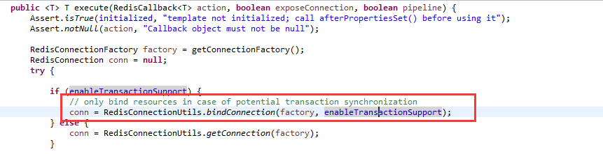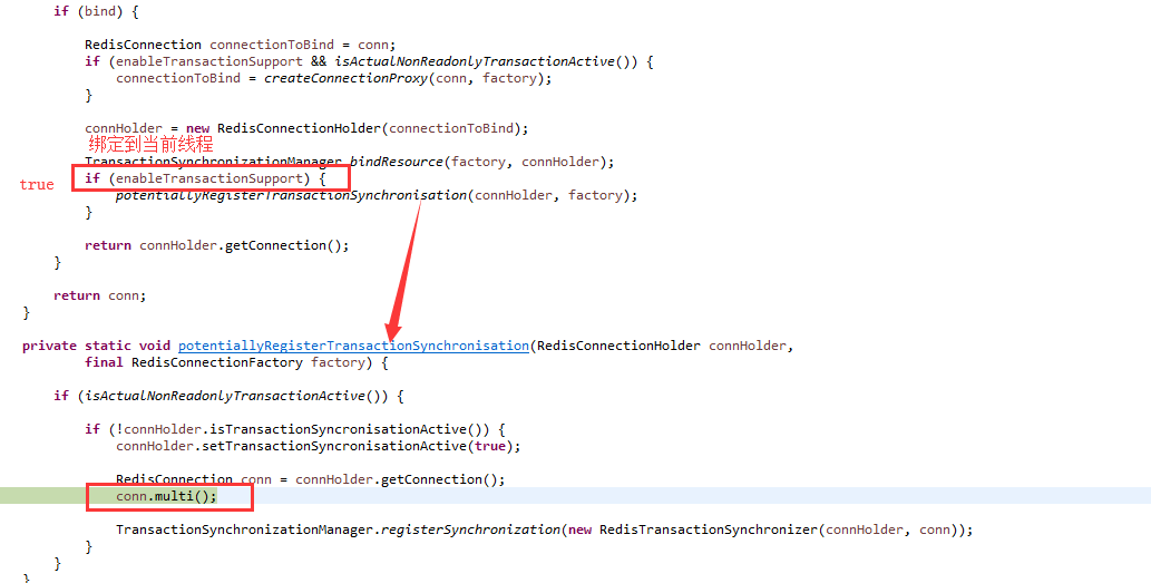 2.RedisTemplate.enableTransactionSupport=true:在获取redis连接时,会将连接绑定到当前线程,并且自动执行MULTI命令: