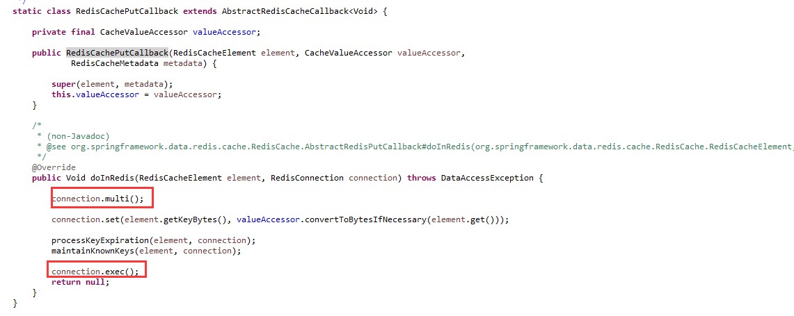 以put操作为例,RedisCache会将key-value最终封装为一个RedisCachePutCallback对象,最后redisTemplate操作这个对象时,同时执行了MULTI和EXEC命令: