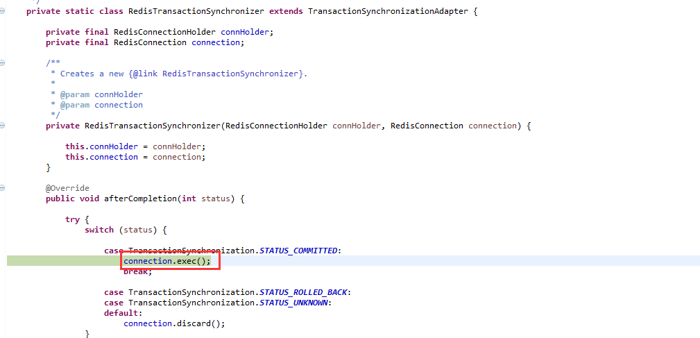 如果外部有其他事务(如mysql),则在事务结束后调用afterCompletion方法执行EXEC命令结束redis的事务: