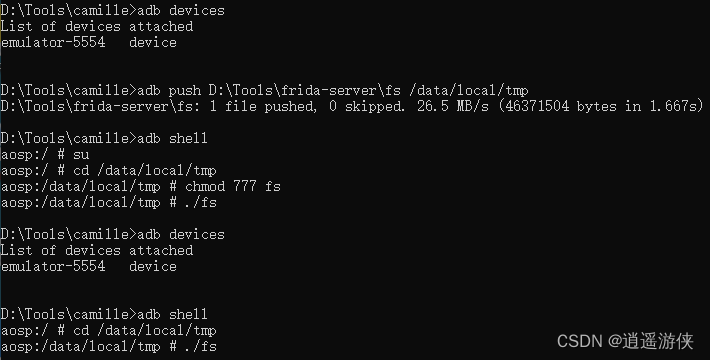 准备就绪,使用adb连接安卓模拟器,命令大致如下,启动模拟器上的frida-server服务