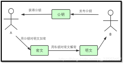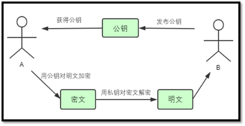 RSA算法是一种著名的非对称加密算法,所谓非对称加密就是说用来加密的密钥和用来解密的密钥是不同的。用来加密的为公钥,是公共的数据,而负责解密的为私钥,是不公开的。利用这种信息不对称的手段,使得该类算法安全性很高,非对称加密算法的大致流程如图1-1。