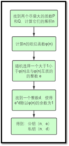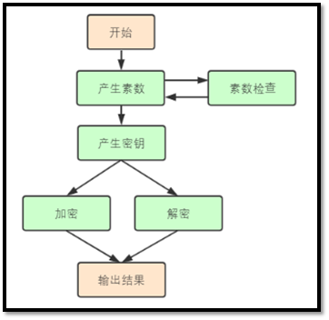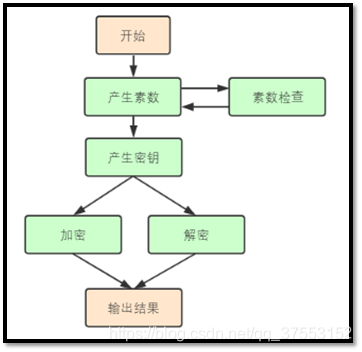 在RSA算法的实现过程中,总体可以分为两大部分,就是产生公钥、私钥和加密解密。我对RSA产生共钥、私钥的流程总结为图2-1。