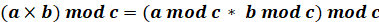 公式看起来不难,但在具体实现中遇到了一些问题。因为e的值通常是三位数,导致a^e的数值太大,就算是使用C++中long long类型也会造成溢出,所以我根据求余运算的分配律进行等价的迭代计算,分配律公式如下。
