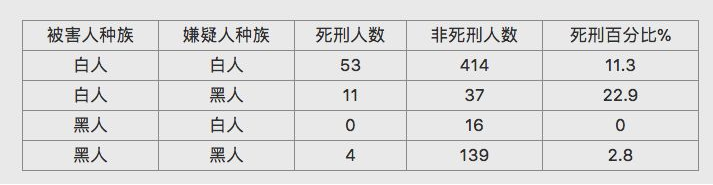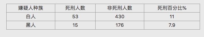 这还不算。分类后的数据显示,如果受害人是白人,那么嫌疑人就更容易被判死刑。如果被害人是黑人,嫌疑人被判死刑的可能性很低。种族歧视昭然若揭啊。