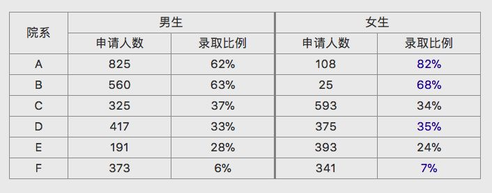 你可以看到,在6个院系的4个里,女生的录取率大于男生,女生只在2个院系里容易折戟。加利福尼亚大学伯克利分校的统计学教授 Peter Bickel 后来发现,如果按照这样的分类,女生实际上比男生的录取率还高一点点。