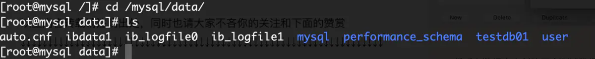 然后在数据库中创建两个测试数据库user,testdb1,然后在虚拟机的/mysql/data中查看是否数据库文件是保存在映射的文件夹内的