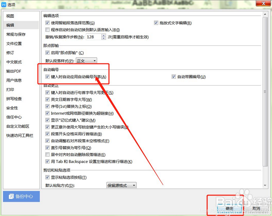 取消勾选“自动编号”栏目下的“键入时自动应用自动编号列表”,点击右下角的“确定”键,然后退出子窗口。