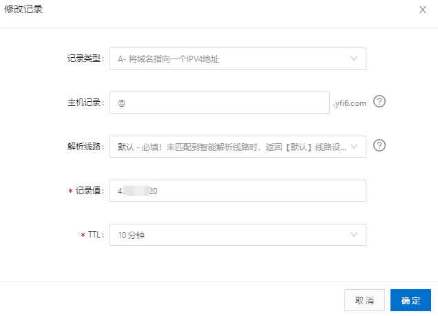 两条记录值,一个是www,一个是@,记录值是刚刚购买的阿里云服务器的地址(公网IP),
