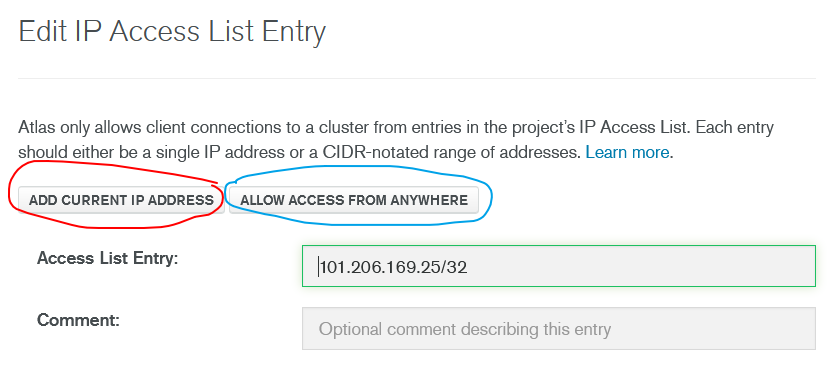 如图:红色圈起来的就是添加当前的ip地址(当本机ip地址更改后需要重新编辑),蓝色圈起来的 代表允许从任何地方访问(不需要每次编辑,一劳永逸),再然后等待配置完成。