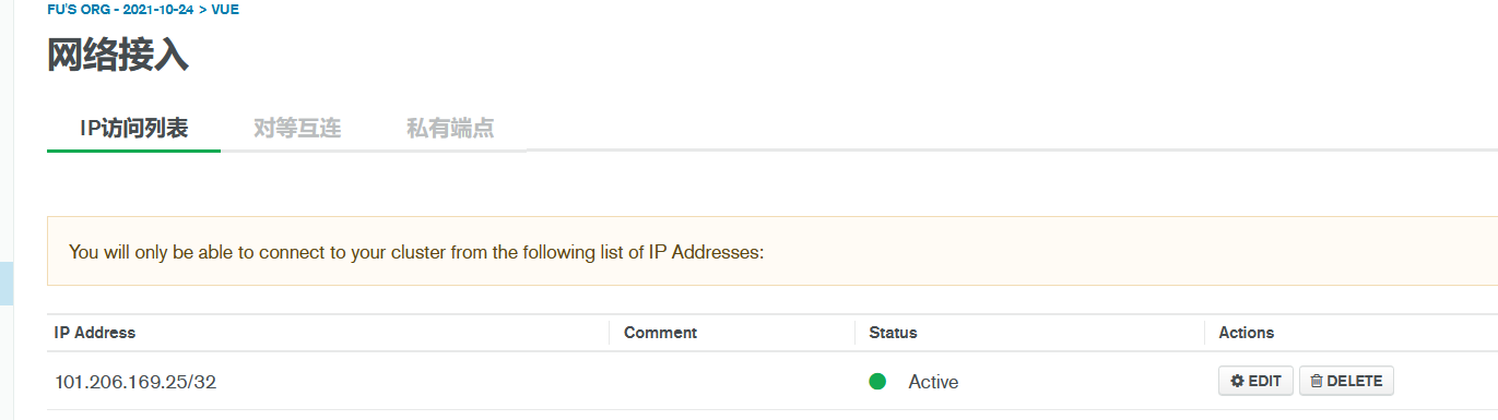 这只是mongodb compass 连接不上远程服务器的一种方式,也是比较容易忽略的,如果在创建集群的时候选择使用的IP地址为(0.0.0.0/0)就不会出现这个问题。。。