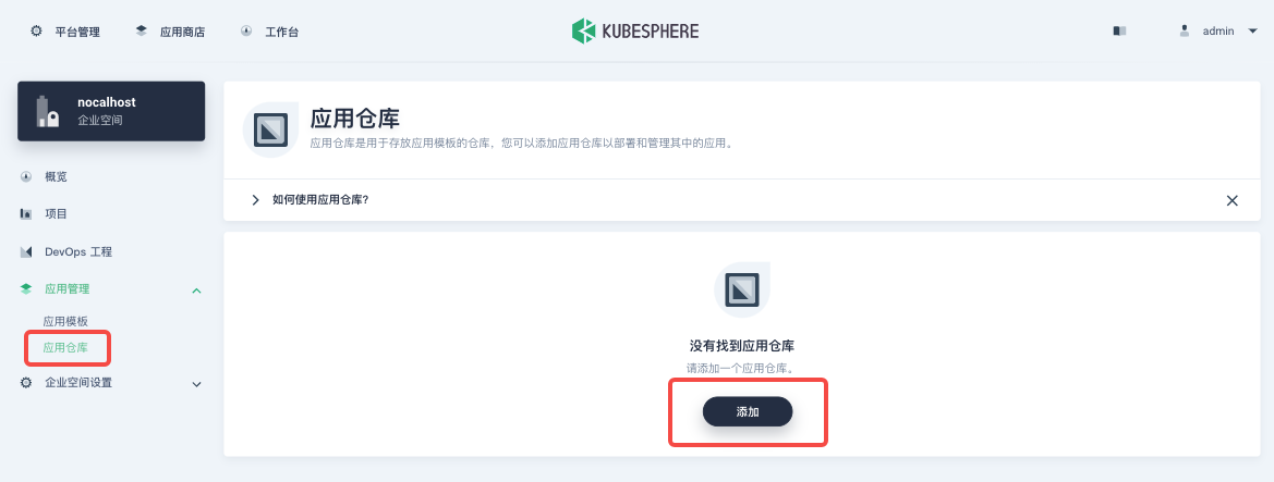 首先,使用具备企业空间管理权限的账号登陆 KubeSphere 并进入您选定的一个企业空间,在您的企业空间中,进入「应用管理」下的「应用仓库」页面,并点击「添加仓库」。