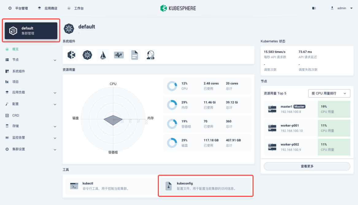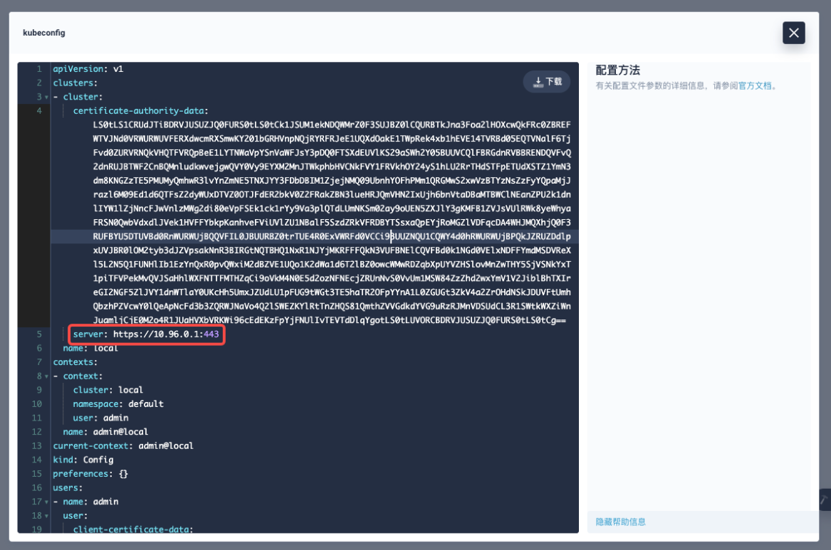 这里有多种方式获取目标集群的 kubeconfig,例如您可以返回 KubeSphere 并进入集群页面,获取当前集群的 kubeconfig 文件。注意,如果使用 kubeconfig 文件的应用部署在当前集群外,您需要将 clusters:cluster:server 参数的值修改为对外暴露的 Kubernetes API 服务器地址。