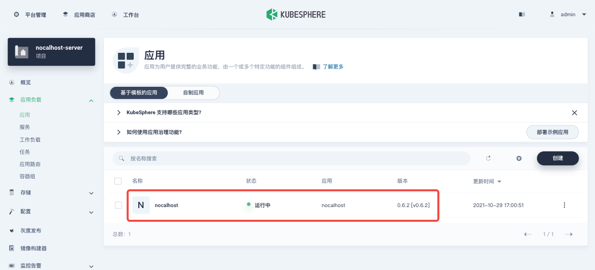 至此,已完成在 Kubesphere 中快速部署 Nocalhost Server,如您是第一次使用 Nocalhost Server,可继续以下关于 Nocalhost Server Dashboard 配置、在 Nocalhost IDE 插件中进行开发体验的内容。